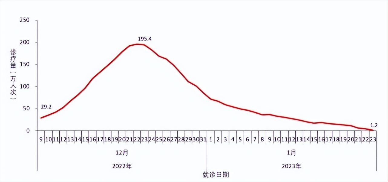 全国二级以上医疗机构和城市社区卫生服务中心发热门诊(诊室)就诊人数于2022年12月22日达到峰值195.4万人次,随后连续下降,2023年1月23日下降至1.2万人次,较峰值下降了99.4%(图2-3)。
